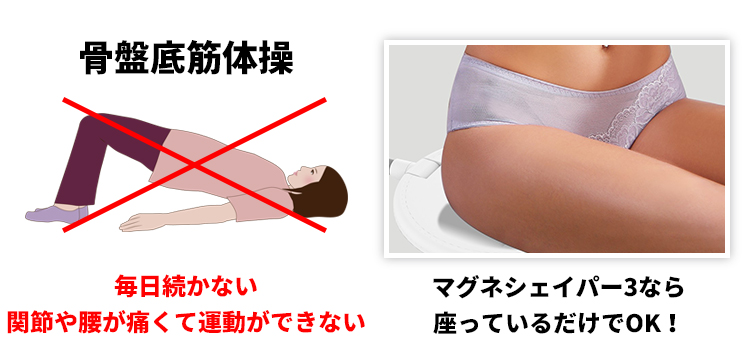 性別関係なく年齢を重ねてくると気になってくる尿もれ。その主な原因の一つは「骨盤底筋群の衰え」です。特に女性では出産を経験することで、尿もれだけでなく、子宮脱などの骨盤臓器脱の悩みも。骨盤底筋の緩みを改善するためには骨盤底筋体操などで骨盤底筋群を鍛えることです。「マグネシェイパー3」はオプションの座面プローブを使用することで骨盤底筋群のトレーニングが可能です。運動が続かない方や関節や腰などを痛めて運動ができない方には座っているだけで良いので大変おすすめです。