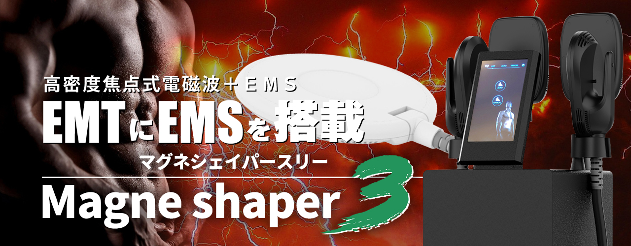 従来の痩身トリートメントは脂肪を減らす事に重点が置かれていました。それは、エステ機器が進化していく中で様々な痩身理論(燃焼、冷却、超音波による刺激など)が実現され「楽して痩せる」が当たり前の事となってしまったからです。苦しくて辛い運動(筋肉を鍛える事)は二の次になっていました。しかし、それでは真の意味での「美しく健康的に痩せる」が実現できません。この理想に近づけるにはやはり運動が不可欠なのです。この「マグネシェイパー3」は「美しく健康的に痩せる」を目指すことのできる痩身機です。